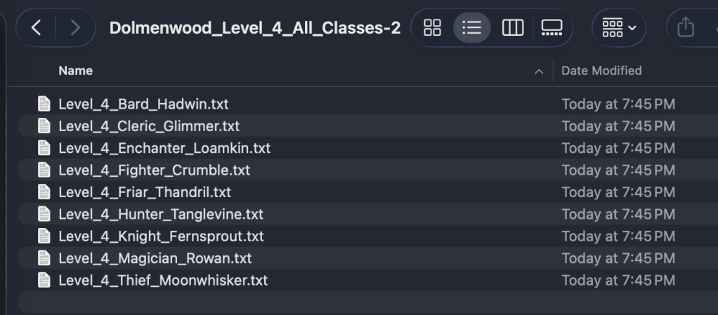 I want to create an app that allows me to generate a lot of pregenerated characters at the same time, by level. I want to be able to select the level, and then generate one character from each of the 9 Dolmenwood classes. These text files should be exportable all at once, perhaps as a zip.