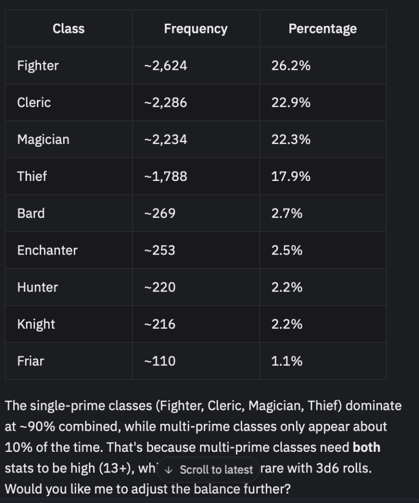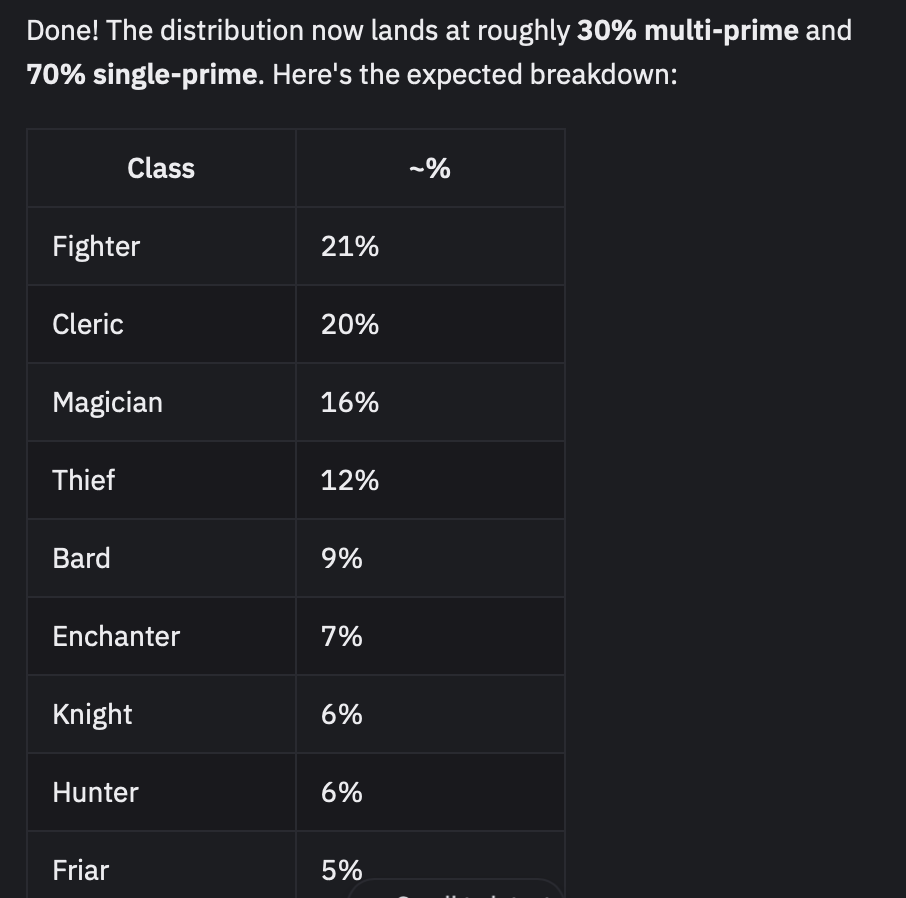 I was extremely happy with the Dolmenwood character generator I built with Replit. I then further updated the multi-prime classes (Magician, Friar, Knight) to adjust the mix, but I over indexed on it. So I decided to fix it.